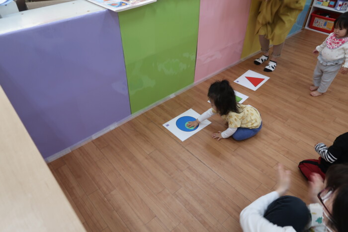 ECCジュニア英語教室でした。丸・三角・ハートの単語を教えてもらいました。