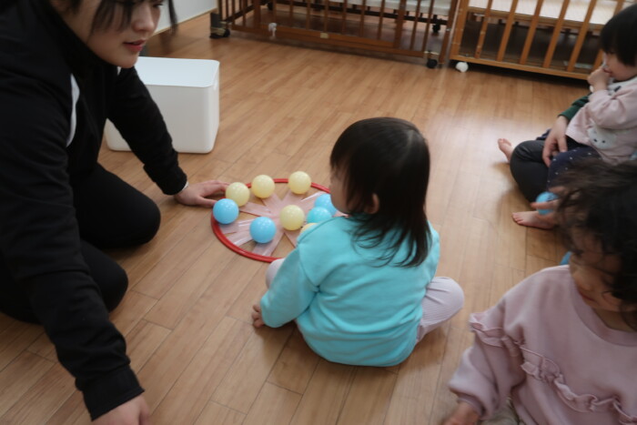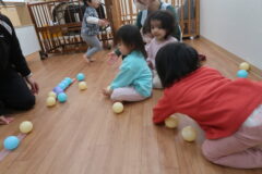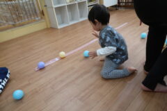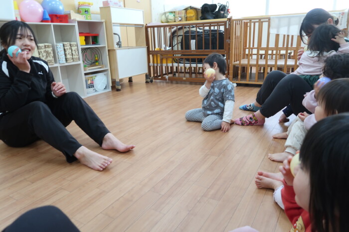 体操教室でした。ボールを使って体を動かしました。